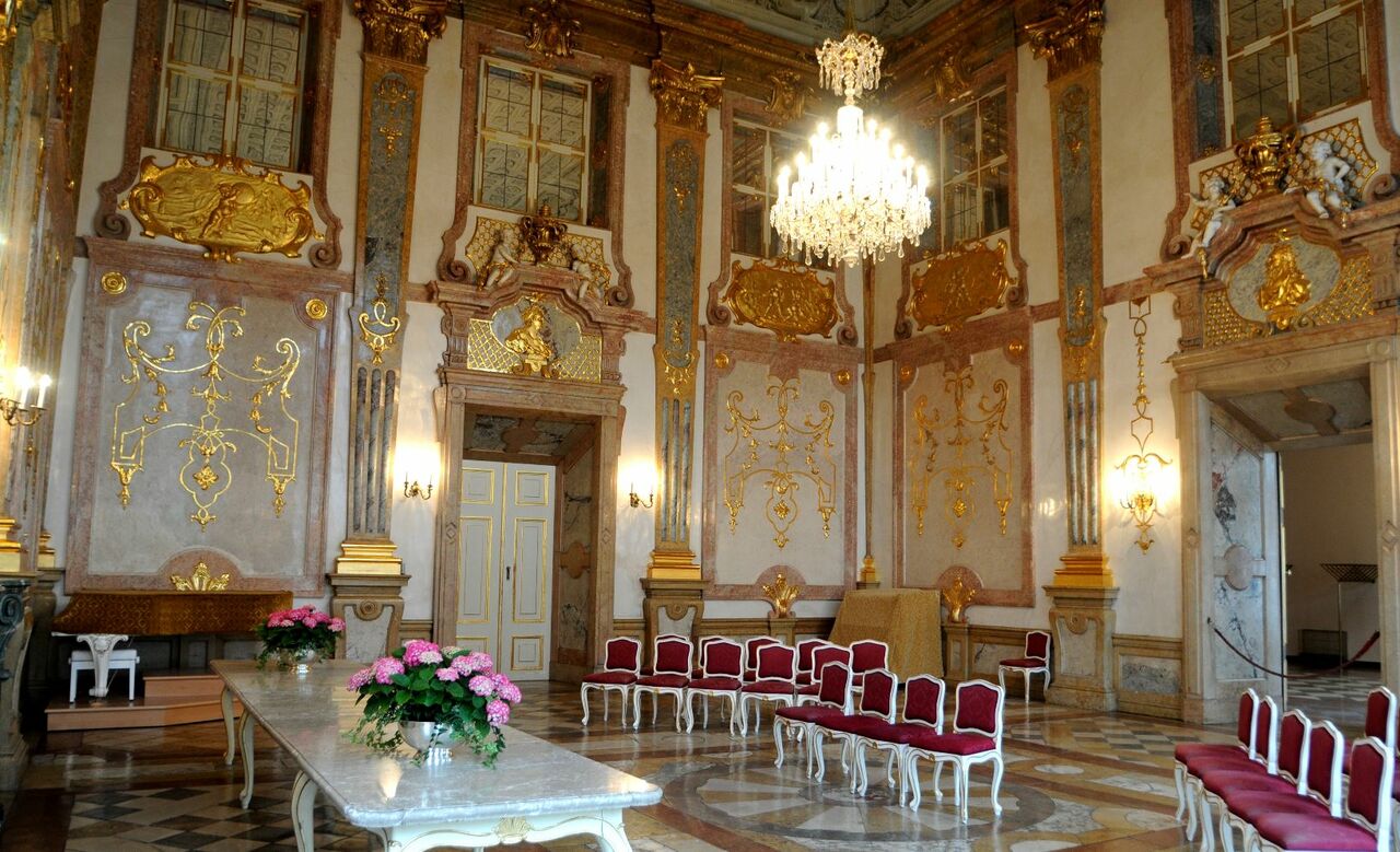 Wir starten im Schloss Mirabell. Um 12.20 Uhr ist unsere Trauung im Marmorsaal.